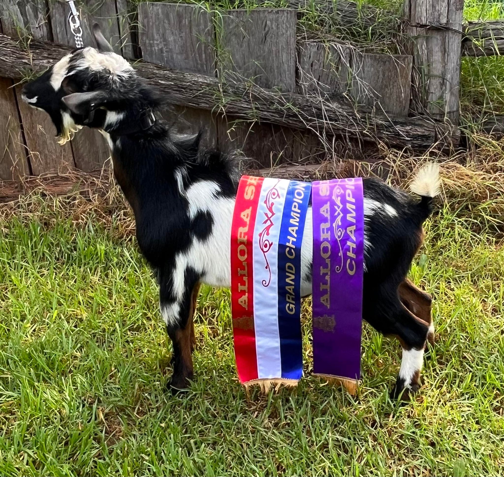 Our two youngsters, Ivydale Bettina and Ivydale Brynn also did us proud. Bettina was 1st ND Doe Kid under 12 months, Champion ND Doe Kid and Champion All Breeds Doe Kid. Brynn was 1st place ND Buck under 12 months, Champion ND Buck, Champion All Breeds Buck and Grand Champion Buck.