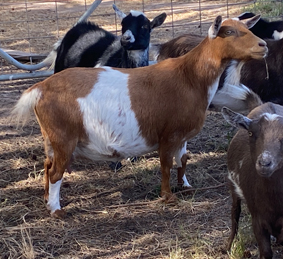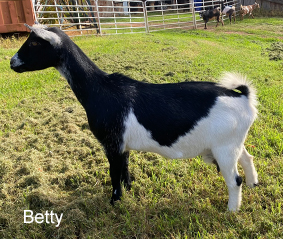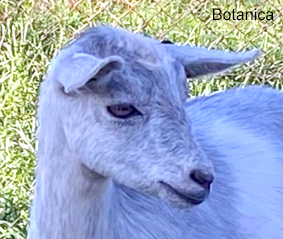 Botanica is a very pretty silver belted doe with lovely body length.  She has a wonderful steady temperament and is quite a character to live with.  In December 2021, Botanica  kidded a single buck and in July 2022 she produced 2 bucks so she will not be bred again until 2023.