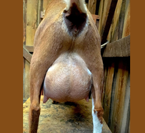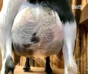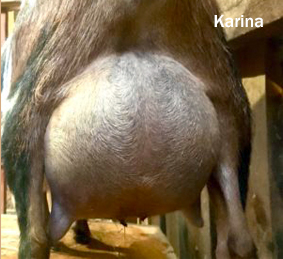 Maude is one of quadruplet doelings born to first freshener FF Karina.   Karina is one of the highest quality dairy goats at First Fleet showing very good capacity, attachment and overall beautiful dairy conformation. Maude shows good conformation and a clean , wide and high arch.  We look forward to seeing her develop.