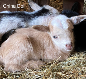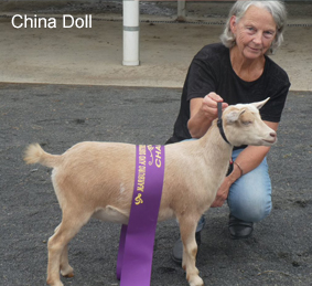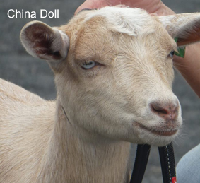 China Doll is so well named. She is a lovely pale gold color with blue eyes and is a super sweet natured doe who always comes up for a pat and a cuddle.  On the serious side, she has done well in the show rings where a long time dairy goat breeder loved her and awarded her Champion Nigerian Dwarf Exhibit.  China Doll has wonderful wedge shaped body, deep and capacious with lovely length.  She has a pretty, feminine head typical of the breed and we have just bred her to Ivydale Cinnabar who also has blue eyes. This combination will produce blue eyed kids so watch this space!!